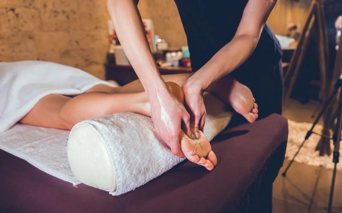 Masaje con aceite para aliviar piernas fatigadas. Mejora la circulación y relaja.