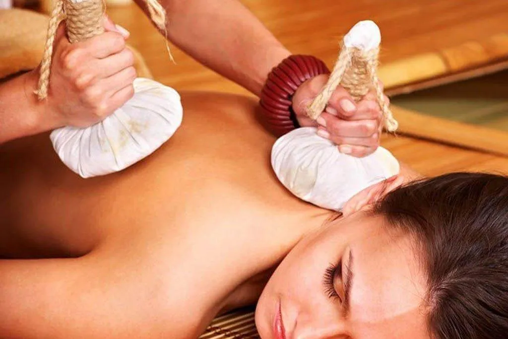 Masaje de hierbas calientes (cúrcuma, jengibre, menta). Relaja y desinflama.